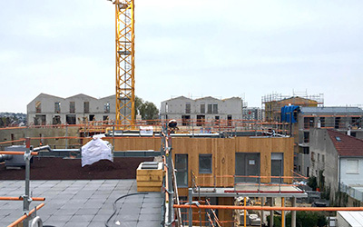 Suite du chantier de l’îlot Michelet à Fontenay-sous-Bois, projet de logements avec Terralia Immobilier et RATP Habitat. La façade en bois progresse, le début du revêtements en aluminium ainsi que les premiers éléments de charpente font leur apparition .