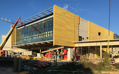 Suite du chantier du pôle culturel de Garges-lès-Gonesse à travers une belle lumière automnale : poursuite du gros Å“uvre, début de l’isolation et nous approchons de la pose des premiers éléments de bardage.