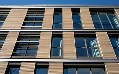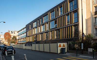Suite du chantier du groupe scolaire Michelis à  Neuilly-sur-Seine. Le bâtiment commence à afficher sa nouvelle façade bardée de bois et les aménagements intérieurs suivent leur cours.