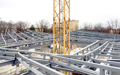 La structure métallique de la médiathèque de Sainte-Geneviève-Des-Bois prend forme. Les courbes caractéristiques de la toiture et le futur patio central commencent à apparaître.