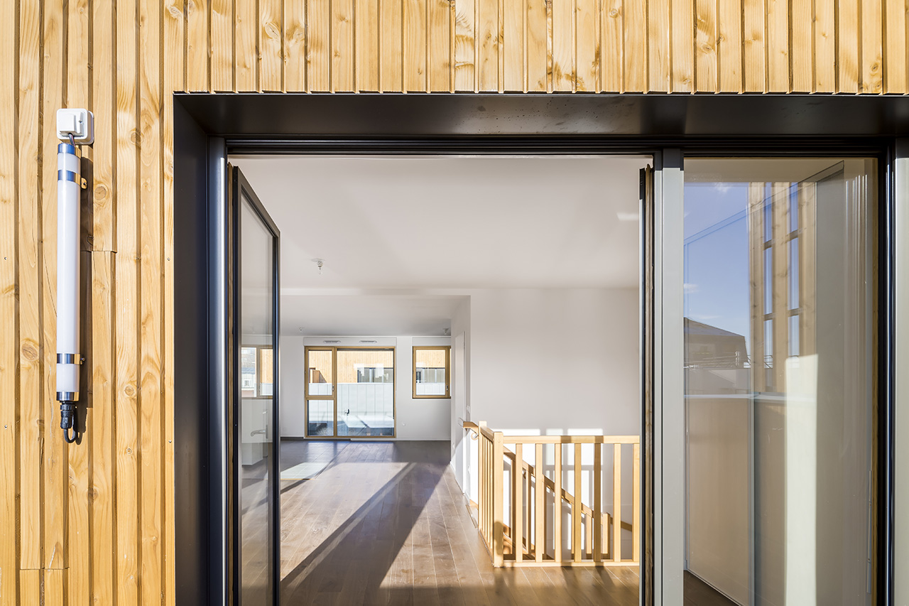 Les façades présentent deux matériaux principaux : au nord et à l’est elles reçoivent un bardage en bois ambré, posé verticalement, à claire-voie.
