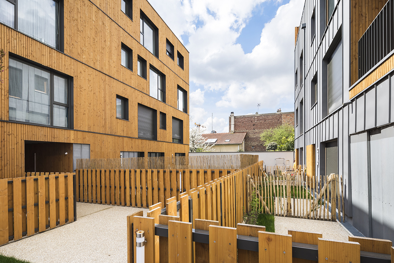 Des espaces collectifs ou des jardins privatifs occupent les espaces libres. Le dessin des espaces extérieurs alterne végétation haute – type cannes – et basse type haie avec des espaces engazonnés. Une progression du plus minéral au plus végétal est organisée depuis l’avenue jusqu’au fond de la parcelle.