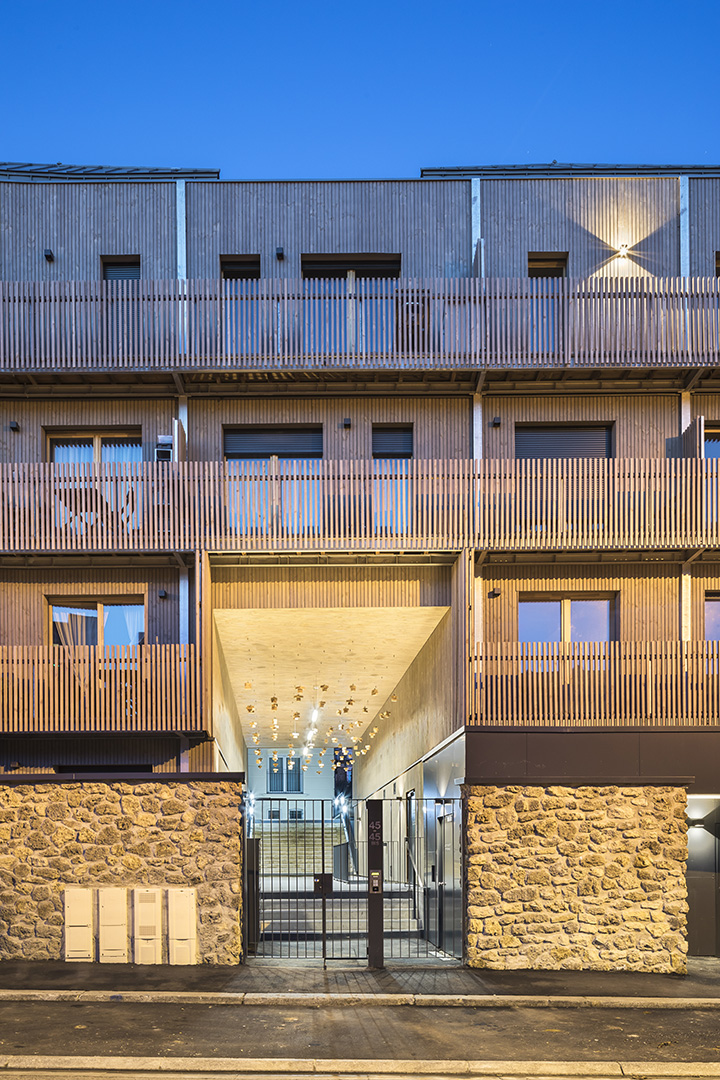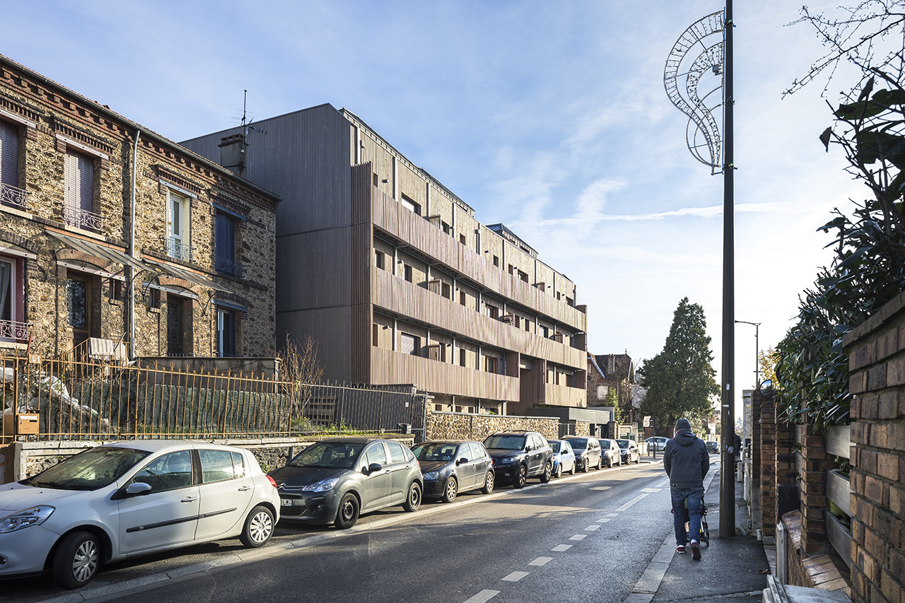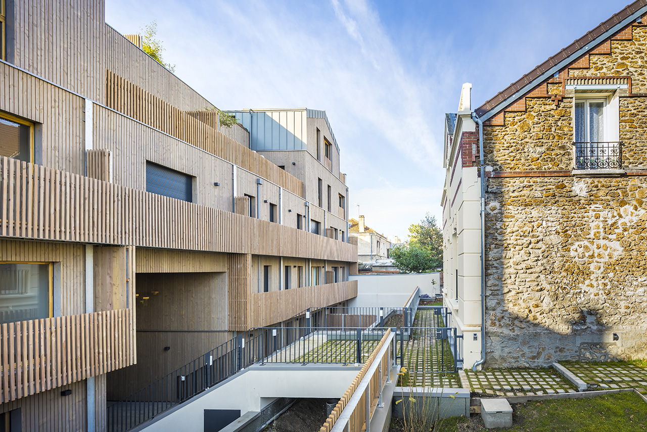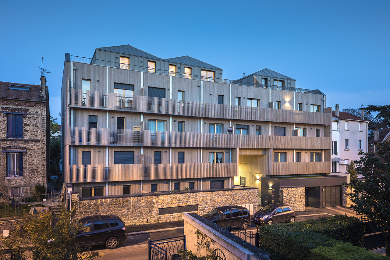 Les planchers sont en bois massif apparent, avec chape acoustique, posé sur un solivage de poutre bois et métal. Le parement de façade est en bois douglas pré grisé et l’étage d’attique en zinc pré-patiné. Les châssis sont en bois naturel. La façade est animée par des balcons filants en tasseaux de bois fixés sur ossature métallique, et les poteaux qui rythment la façade.