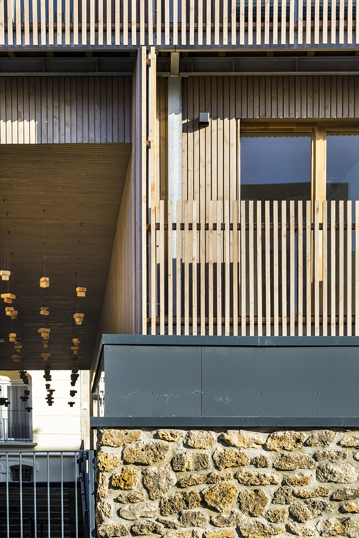 La particularité de ce bâtiment est d’être construit en bois à partir du 1er étage, y compris les planchers.