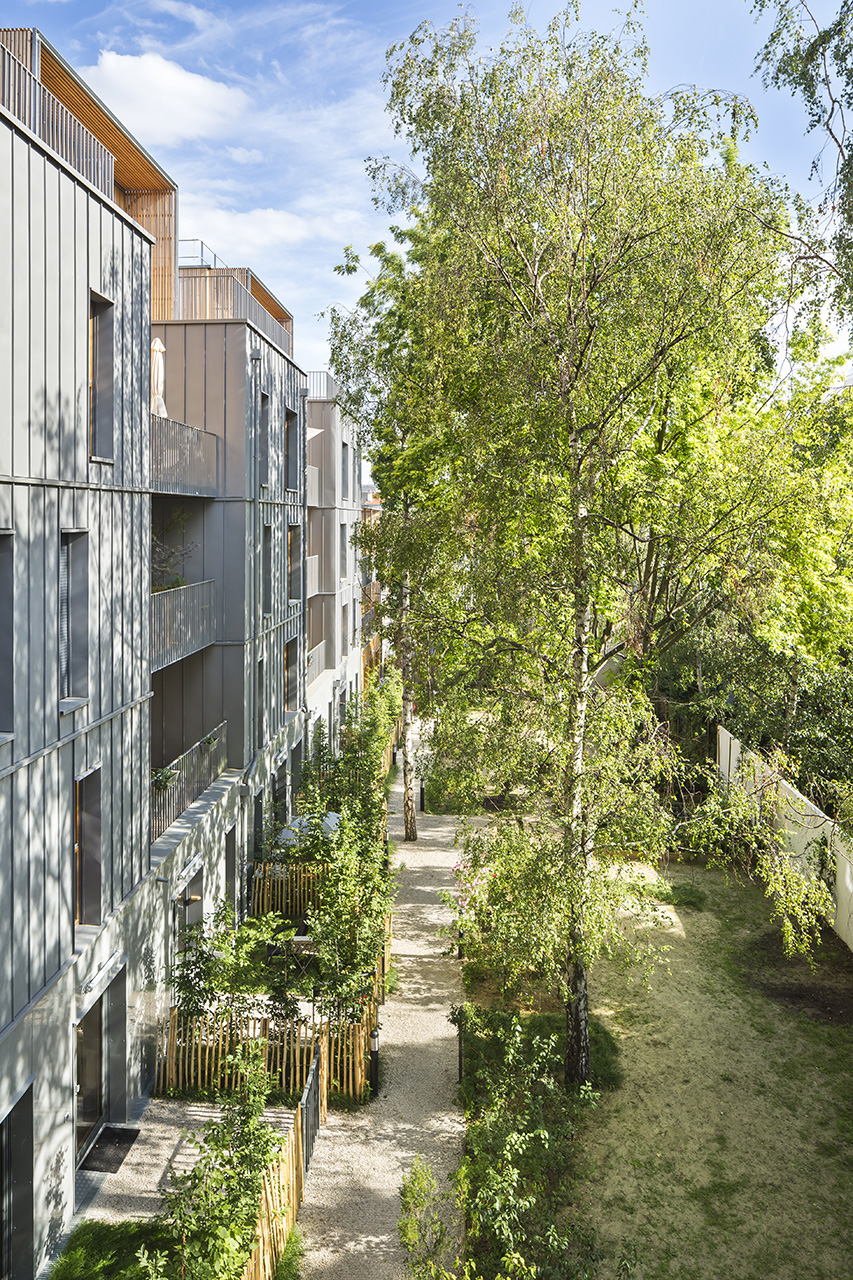 Le bâtiment emprunte à la rue qui l’accueille (Lebour) son inspiration « faubourg ». Lovés autour d’un jardin remarquable et protégé, les logements se fondent dans le tissu montreuillois. L’épannelage subtil et l’emploi de matériaux naturels contribuent à la douceur du lieu.