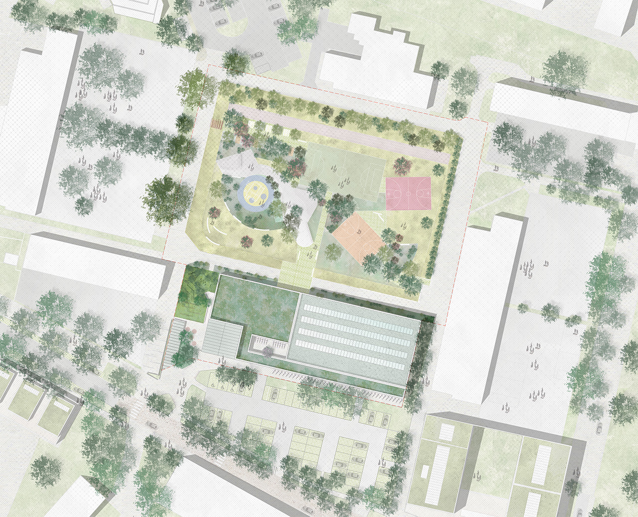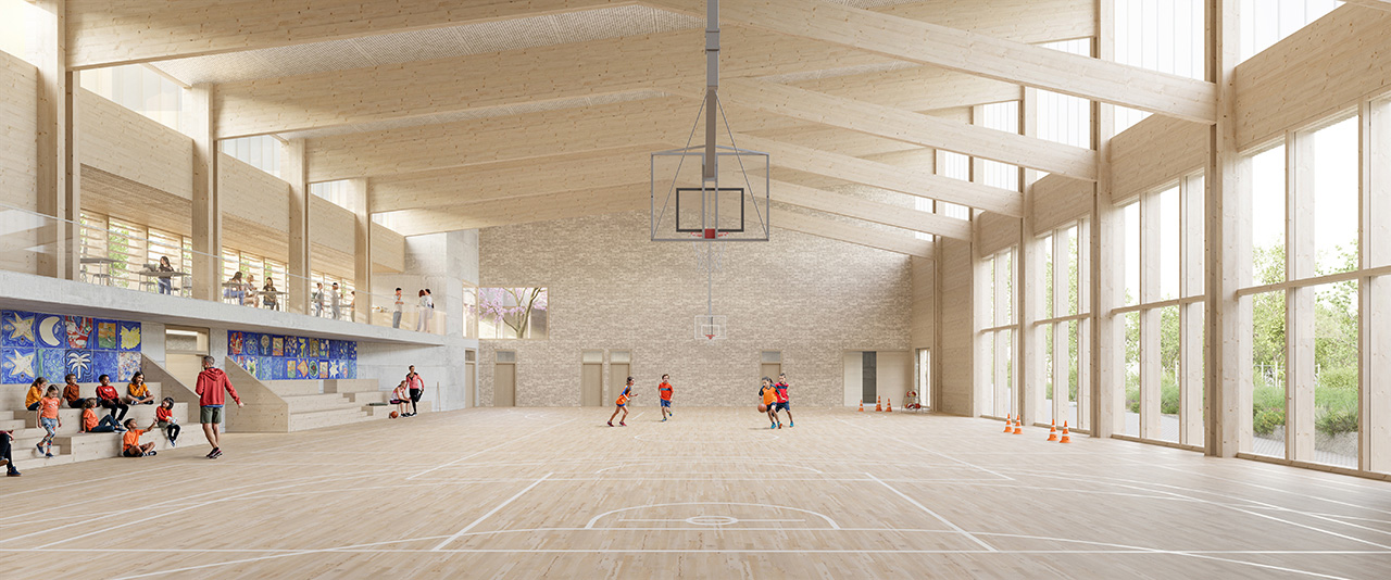 La maison de quartier et le complexe sportif s’inscrivent avec justesse dans ce contexte, en établissant un dialogue sensible avec le paysage du plateau, afin d’assurer des connexions fluides et naturelles avec la rue.