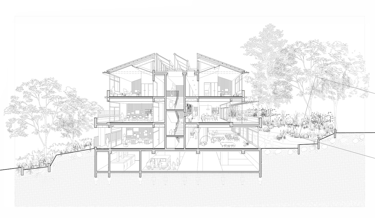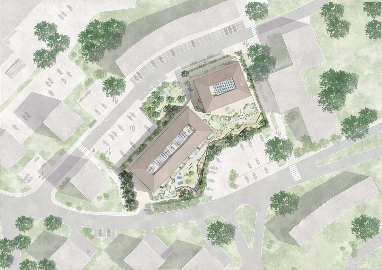 Le projet s’adapte à la topographie encaissée du site, avec un socle unitaire qui mutualise les parkings et les locaux techniques, réduisant ainsi la sensation de densité. Deux volumes distincts, accueillant les deux équipements indépendants, s’ancrent sur ce socle, offrant une lecture unie et valorisante.