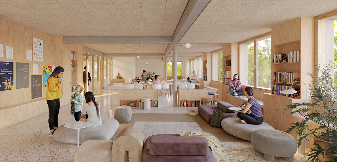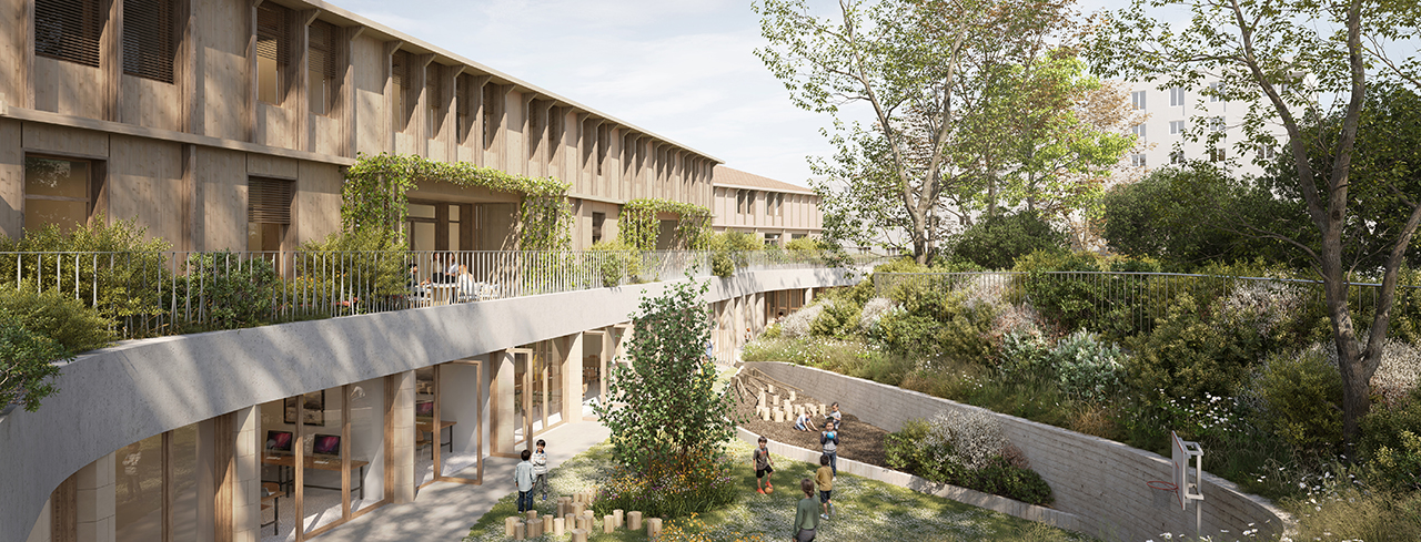 Le projet intègre divers espaces d’activités collectives, lieux d’apprentissage et espaces de vie, répondant à une variété d’usages tout en portant attention aux besoins de chacun. Un parvis bas commun crée un espace de rencontre et d’échange, tandis qu’un parvis haut assure la séparation naturelle des flux entre les différents équipements.