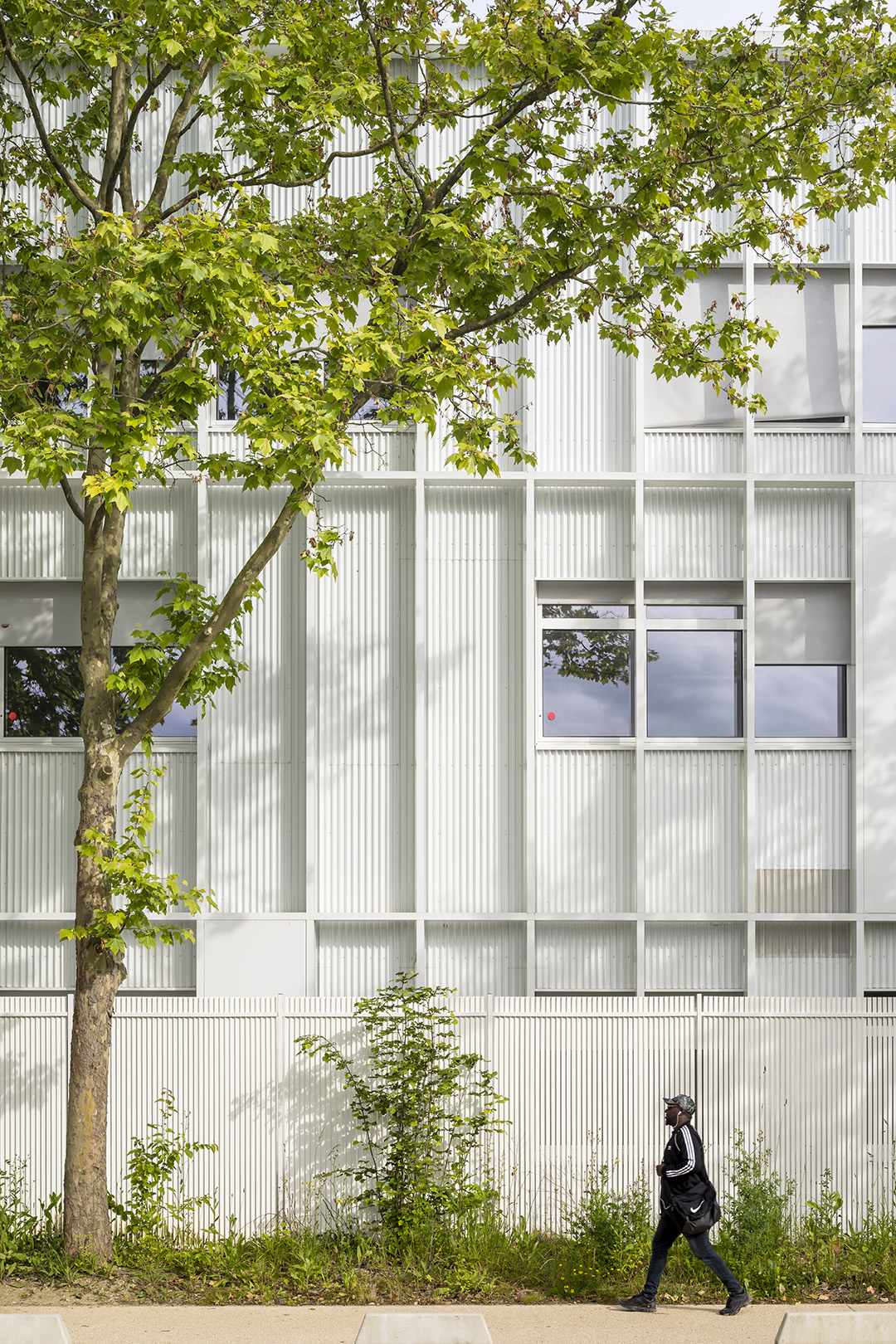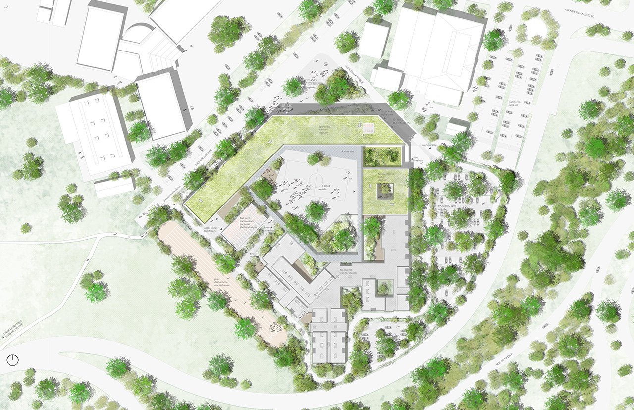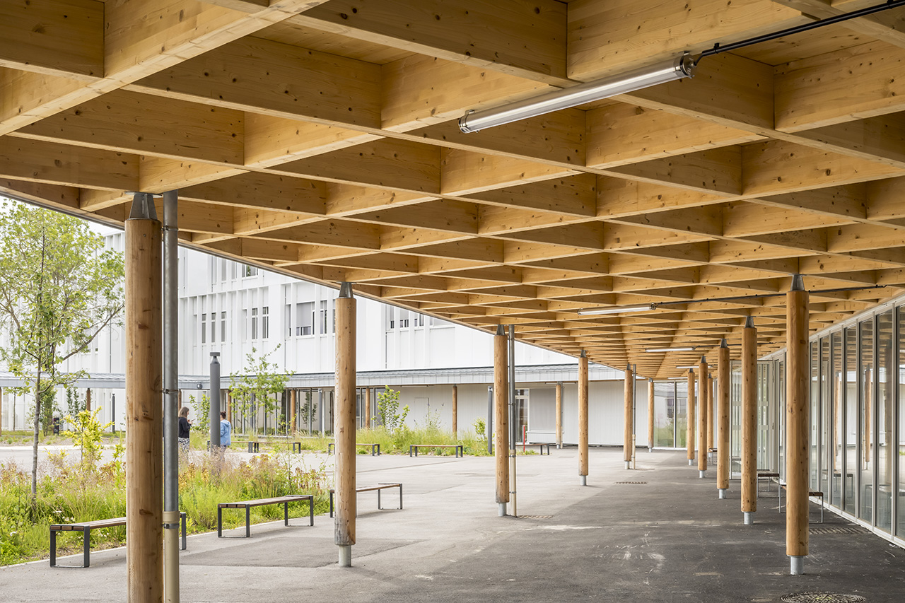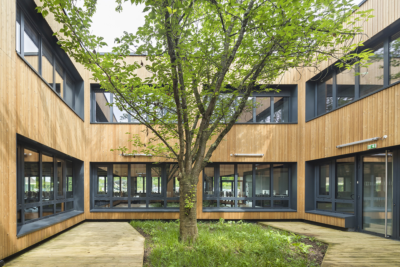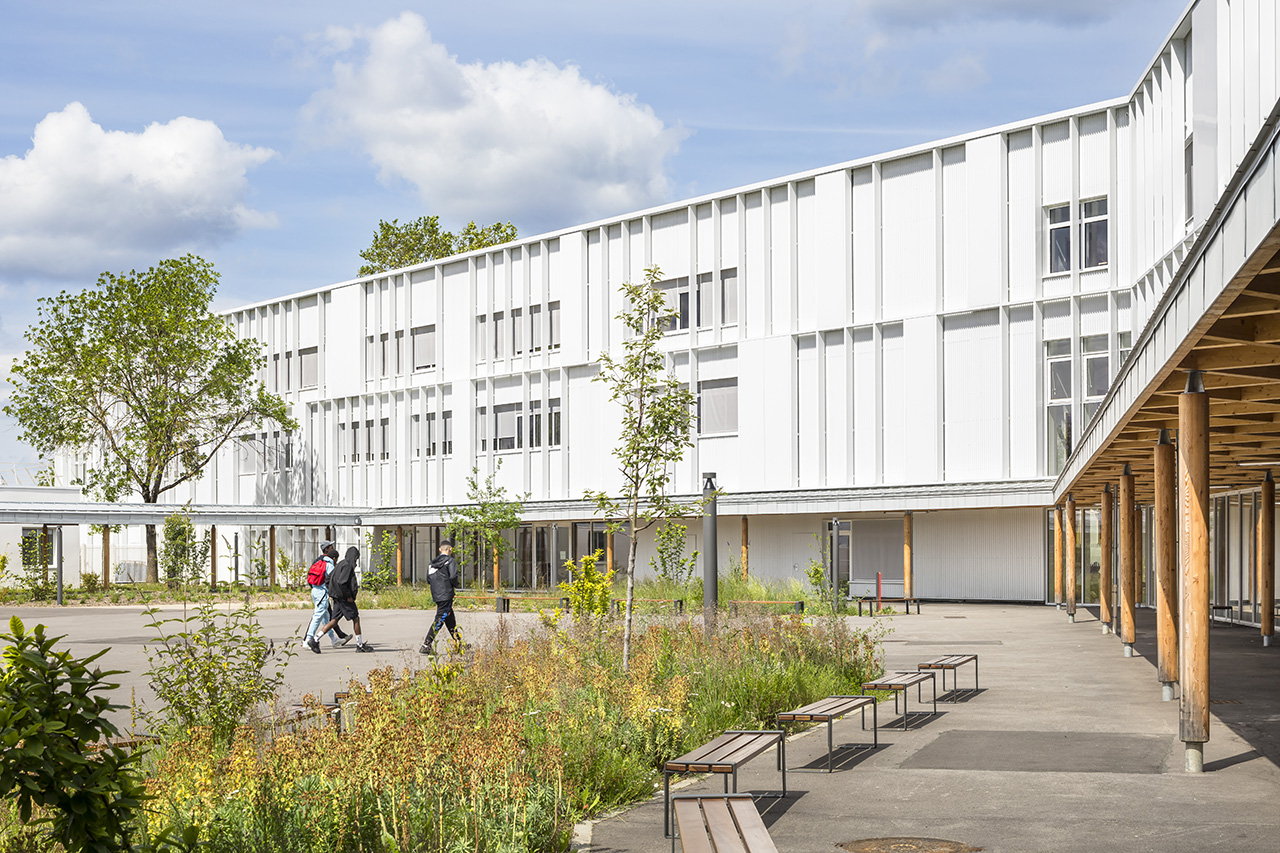 Le nouveau bâtiment complète naturellement le plan masse des bâtiments existants. Il constitue la dernière pièce d’un « tout » créant ainsi une seule unité autour de la cour. Derrière ce front d’îlot réside une cour intérieure fédératrice dont bénéficient les bâtiments existants. Cette cohésion est renforcée par un auvent périphérique en structure bois et revêtement zinc qui assure les liaisons entre le nouveau et l’existant. Depuis le parvis sécurisé, l’ensemble du programme pédagogique est facilement repérable. Cette lecture simplifiée valorise les constructions existantes.