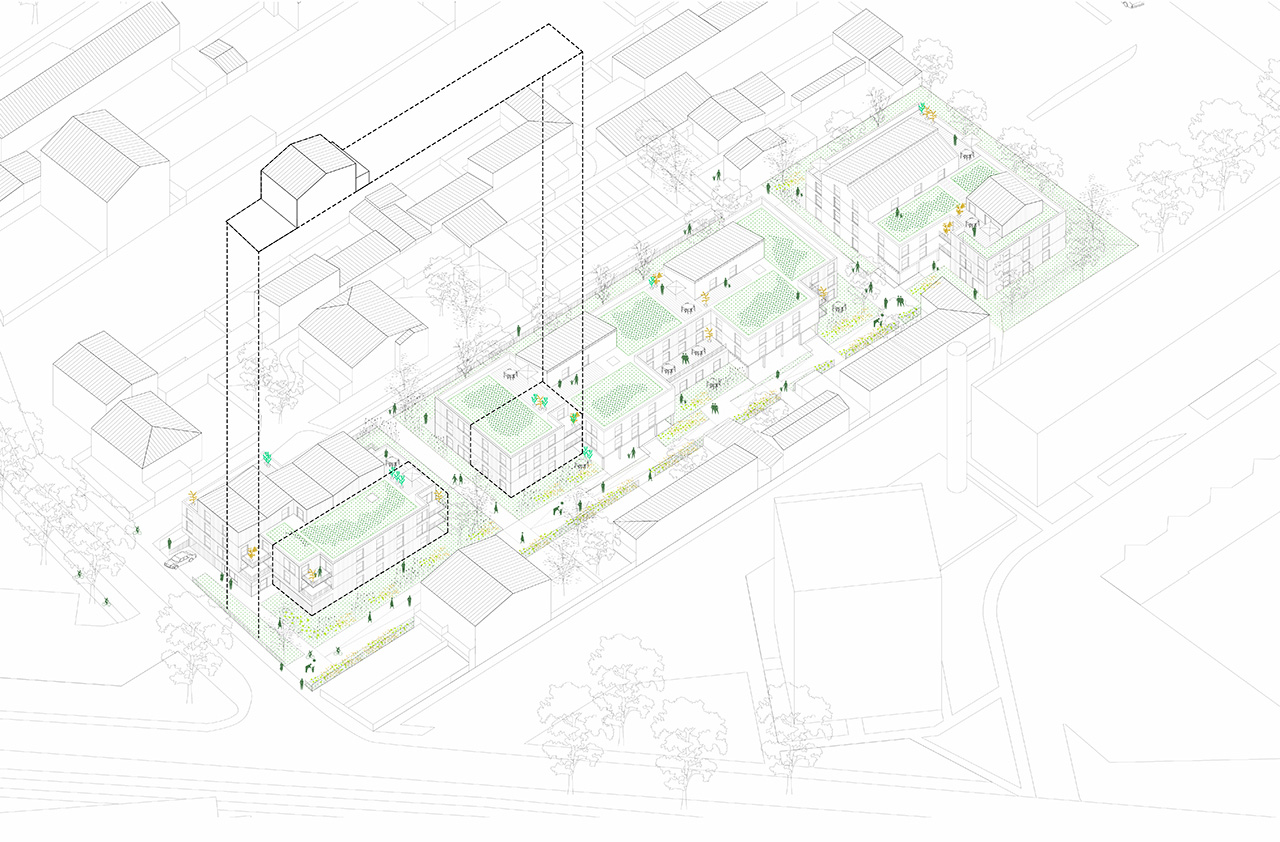 L’une des ambitions du projet architectural est de rendre adéquates les habitations aux besoins – actuels et futurs – des familles qui vont les habiter. Un autre enjeu réside dans le désir de combiner les avantages du plot et du bâtiment linéaire pour créer un modèle de logement intermédiaire, permettant de regrouper des typologies d’habitat différentes. Jouant sur l’écriture et la configuration spatiale, ce vocabulaire permet de réaliser pour chaque bâtiment une identité propre tout en conservant l’harmonie de l’ensemble.